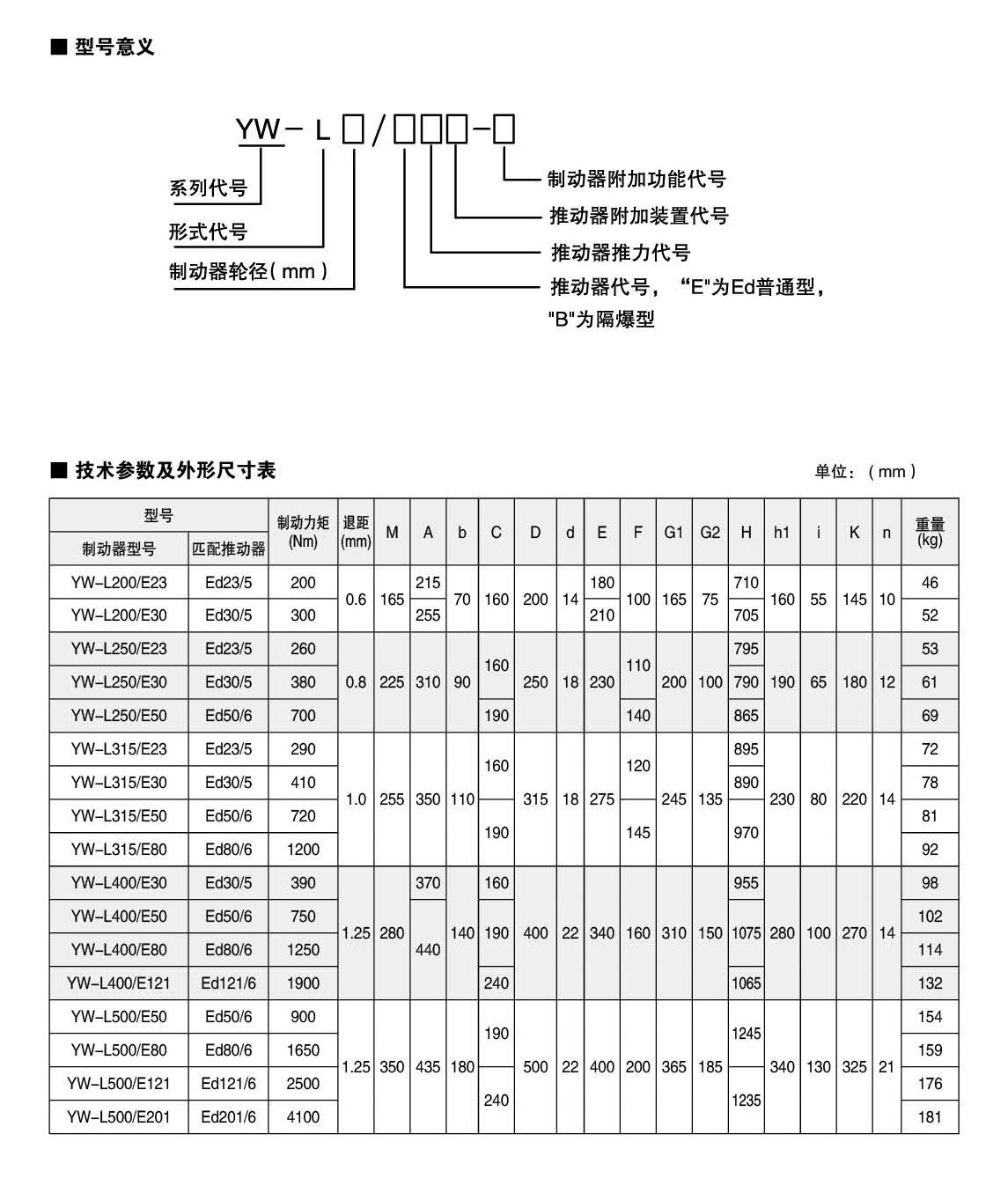 YW-L系列制動器連接尺寸及制動力矩參數(shù)符合JB/T6406-2006標(biāo)準(zhǔn)和DIN15435標(biāo)準(zhǔn)。配套符合DIN15430標(biāo)準(zhǔn)的Ed系列推動器。